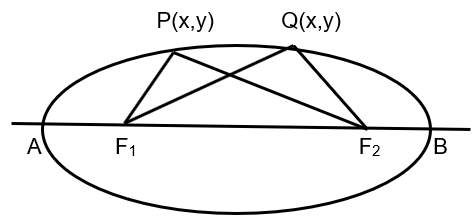 Hence according to the definition sum of the distances of point (x,y) from F1 and F2 is constant. Hence, we can say that PF1 + PF2 = QF1 + QF2 .