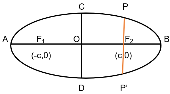 We need to find length of PP’. The two point P and P’ are vertically above and below F2, hence we can say that x-coordinate of P and P’ will be c. In order to calculate y-coordinate of P or P’, we need to replace x by c in the general equation of ellipse and hence we’ll get y-coordinate of P or P’ to be ‘b2/a’ and hence length of PP’ will be 2b2/a.