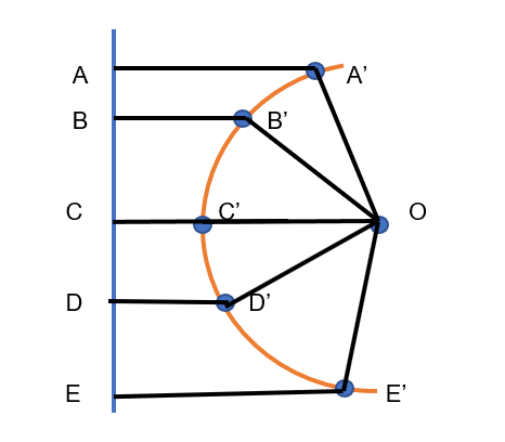In the above figure O is the fixed point and the blue line is the fixed line. Now the path traced by point A’, B’, C’, D’ and E’ are such that;