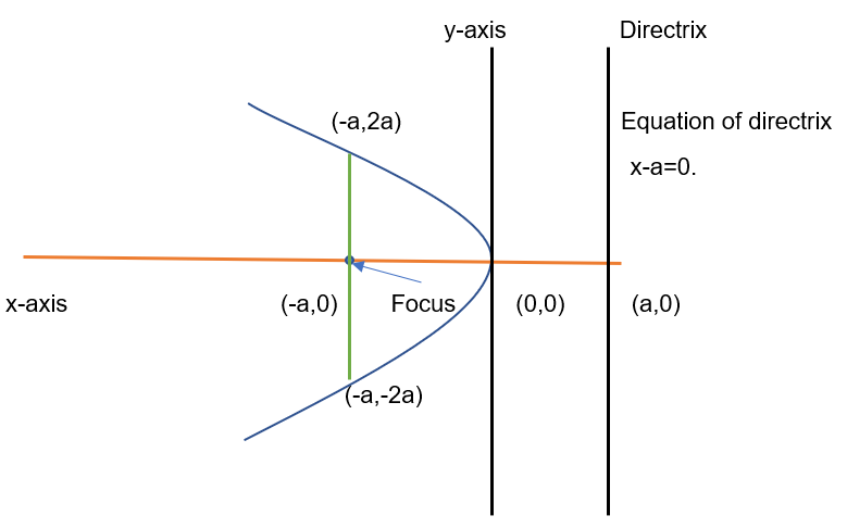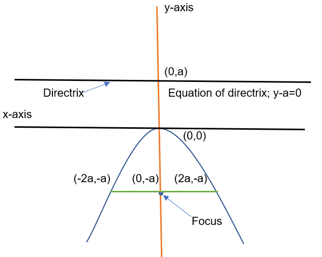 Considering distance between focus and vertex to be “a” units (a<0), hence perpendicular distance between vertex and directrix will also be “a” units.